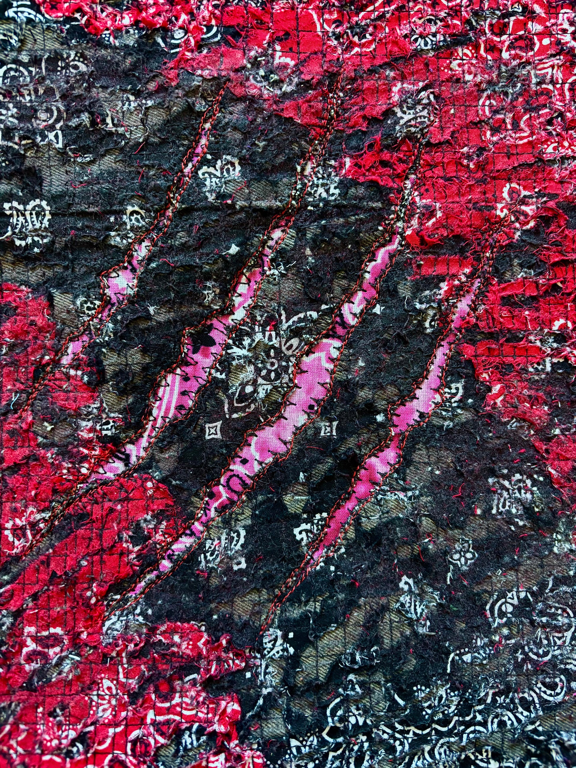 Boro Tote bag made from 100% recycled denim and bandanas. This bag features a pink claw mark with red stitching. It also has an inside pocket for carrying a phone. This is 100% unique and handcrafted taking over 7 hours to make.